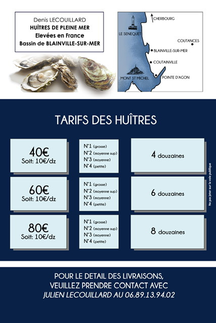 Il propose ses huîtres dont les tarifs sont visibles dans la brochure ci-contre.